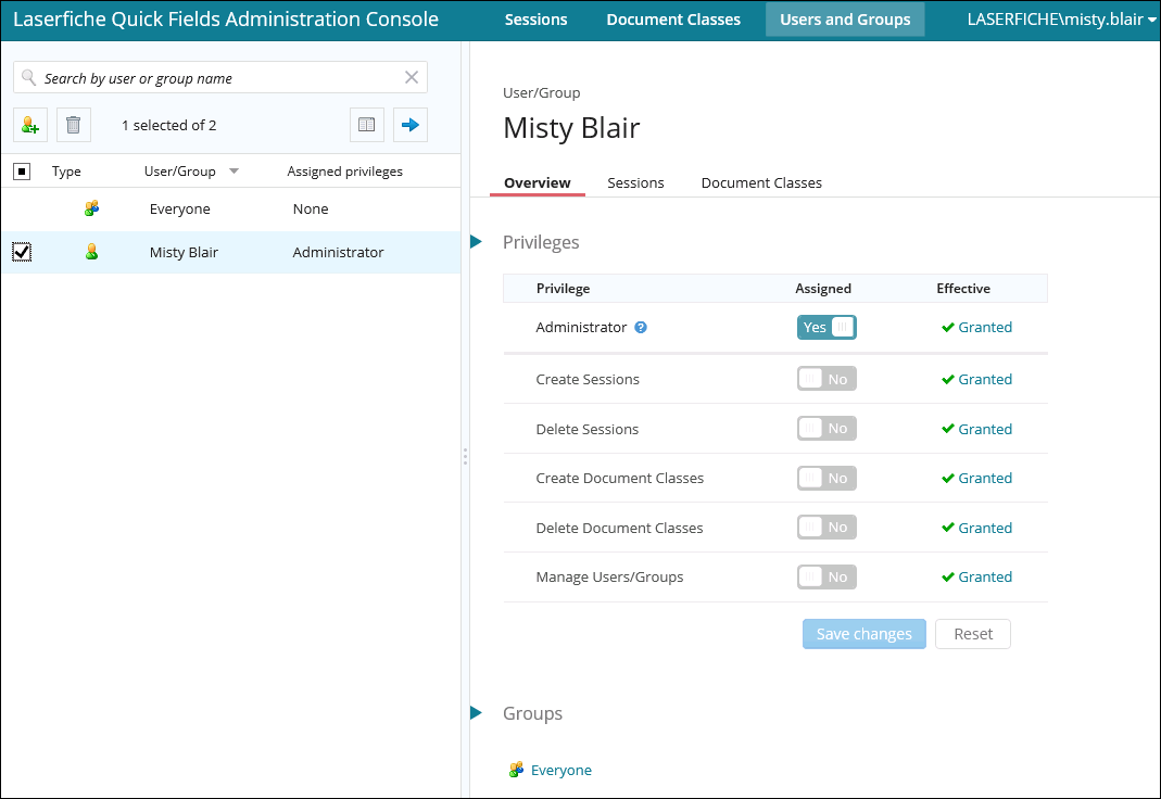 - Users with the Manage Users/Groups privilege will always be able to see the basic information and access rights for all sessions and document classes on the Quick Fields Server, regardless of any denied access rights. For example, if a user is denied access rights, the user will still be able to see the list of users and basic information because they have the Manage User/Groups privilege.