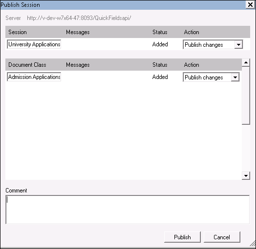 - In the Publish Session dialog box, select Publish changes under Action next to the session and/or document classes you want to publish to the Quick Fields Server. If you do not want to publish the changes to a session or document class, select Don't publish changes.