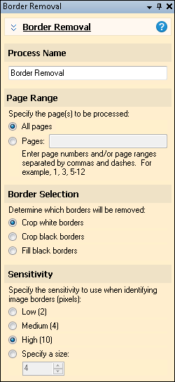 - Sensitivity: Stray marks (e.g., speckles and smudges) can affect the accuracy of border detection. To compensate, define a sensitivity level (in pixels).