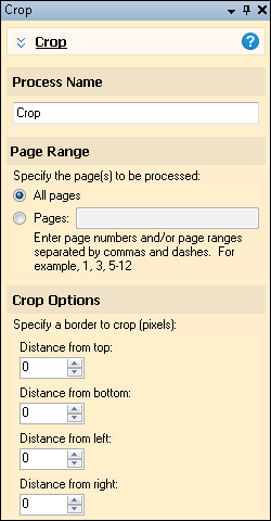 You can configure how much should be removed, or specify that one side of the image should not be altered by setting a value of 0 (zero) for that edge. Crop affects the size and dimensions of the image, but does not scale it or change the resolution. Because it reduces the overall size of the image, it also saves disk space when the image is stored in Laserfiche.