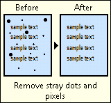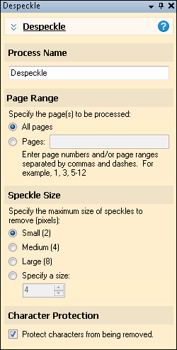 Example: If a period in Times New Roman 12-point font is two pixels tall and two pixels wide, setting the speckle size to one would protect these periods from being removed.