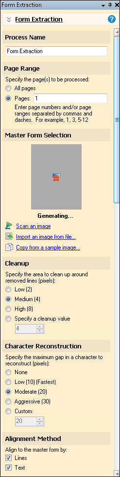 5. Master Form Selection: The master form is an image of a blank form that matches the forms you will be processing. In Form Extraction, the lines and text of the blank master form will be removed from the forms that are filled in, leaving only the data entered on the form. There are three ways to add a master form: