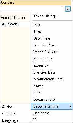 If Laserfiche Capture Engine is not configured in this way, the Capture Engine tokens will not be accessible from the token button menu, because a repository could potentially contain so many fields that it would be difficult to display them all in Quick Fields. If you are using Laserfiche Capture Engine but not retrieving documents by template or field, you can still use Capture Engine tokens by entering them manually. The syntax for a Capture Engine token is %(Field.Fieldname). Note that this is subtly different from a Quick Fields field token (Quick Fields token syntax is plural: %(Fields.Fieldname)