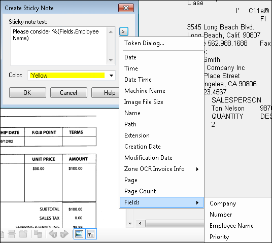 during Post-Processing to add a sticky note to each document that says "Please consider" and she wants the field value generated during Page Processing to be placed after this phrase. She uses a field token for the Employee Name field. She could have used the value from the Zone OCR process, but since Zone OCR is not always 100% accurate, she wanted to wait until after Revision and use a field token instead. The sticky note text will look like Please consider %(Fields.Employee Name). Upon storage, the value in the field will replace the token in the sticky note. When the documents are stored in Laserfiche, the sticky note text will look similar to Please consider Bob Smith.