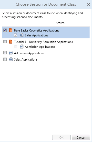 - Choose session or document class: This option lets you select a specific session or document class to use to identify and process your scanned documents. Select the desired session or document class in the Choose Session or Document Class dialog box. You can search for a specific session or document class using the Search box at the top of the dialog box. When finished, click OK.
