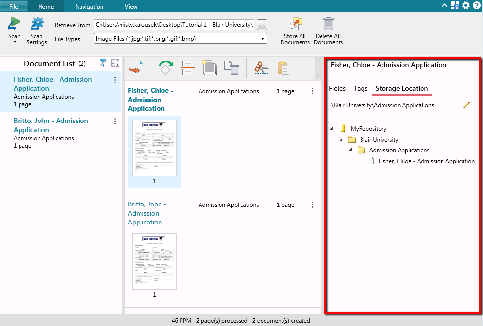 Once documents have been scanned and modified in Quick Fields Scanning, the next step is to store them to Laserfiche. When a document is selected in the Document List Pane or in Pages View, its repository storage location will be displayed in the Metadata Pane on the right under Storage Location.