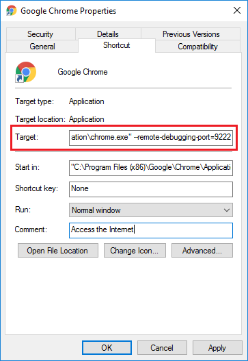 - In the Chrome Properties dialog box, navigate to the Shortcut tab.