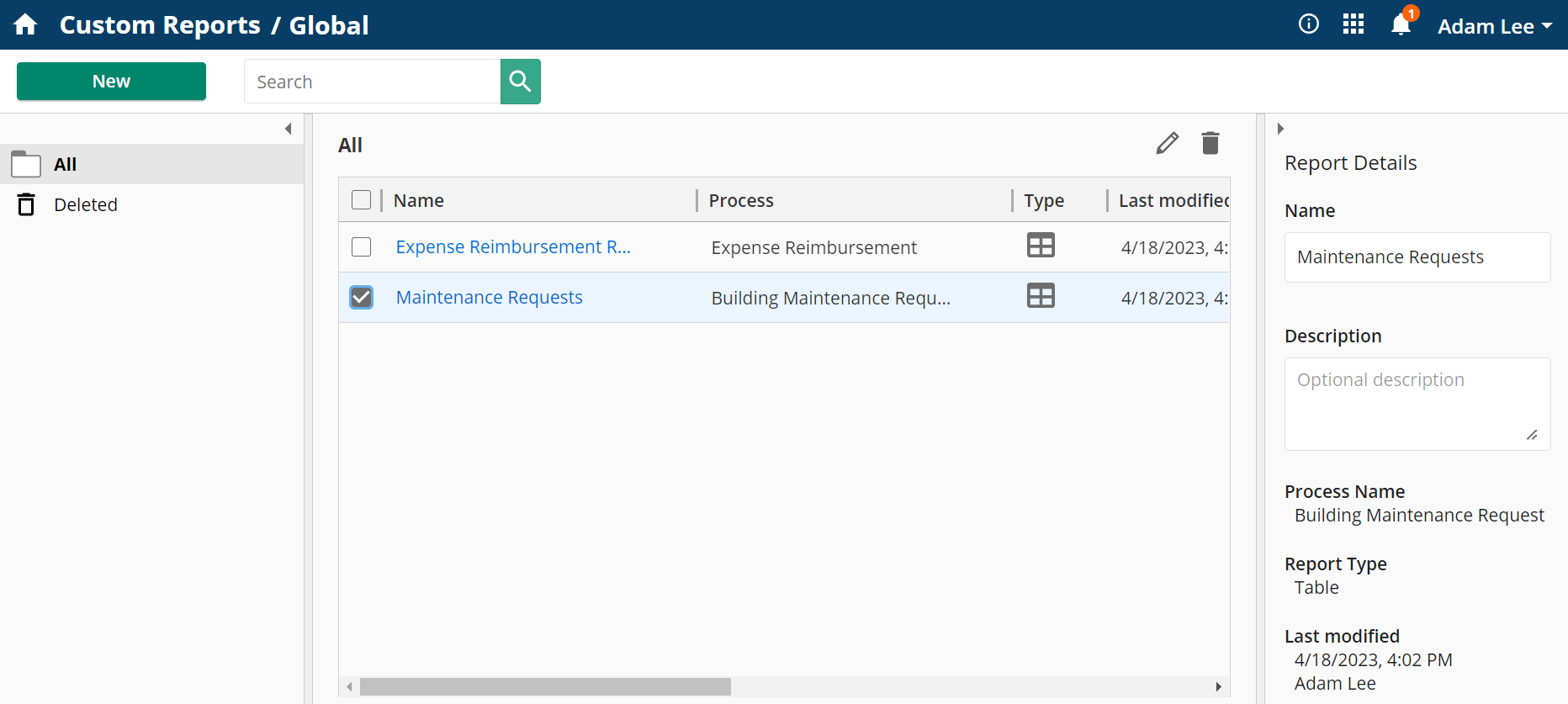 The right pane will display detailed report information for a selected report. You can change the name and description of a selected report within this panel, and view information on the process, report type, and modification details as well.