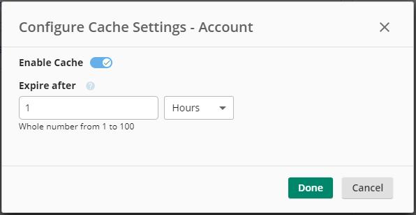- Set the span of time that data should be cached. You can set for seconds, minutes, hours, or days, from 1 to 100 in whole numbers.