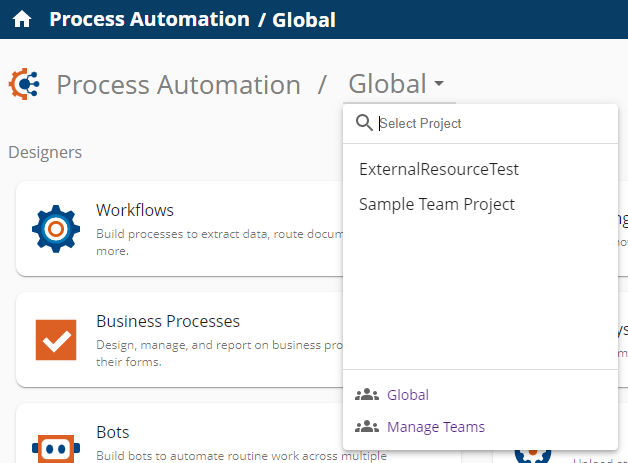 With the introduction of project security, the Process Automation landing page has become the Global project dashboard. From here, users can access any assigned projects through the dropdown menu attached to the selected project indicator. The dropdown will only list projects that the user has access to - either through membership in the team that owns the project or if allowed by the Project Access settings on the project itself. See Determining Access Rights for more information.