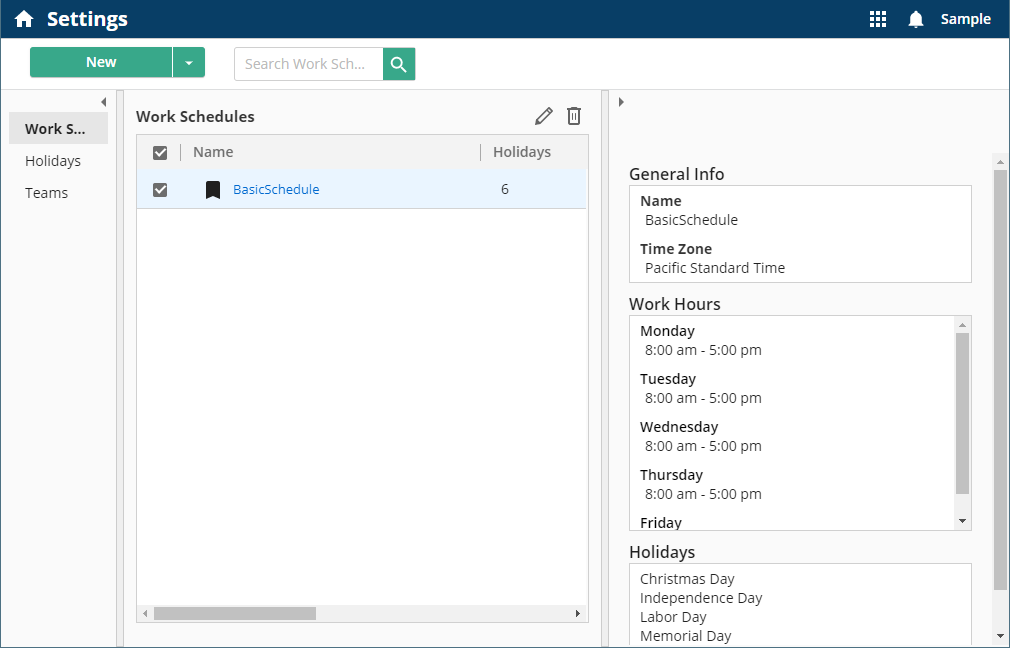 When you create a work schedule, you must specify the work hours and time zone of your organization. You can also include holidays. You can select the holidays you want to include from the centralized list of holidays.
