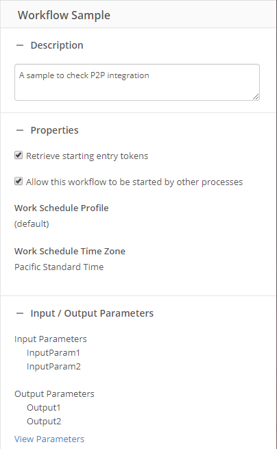 Input parameters will be set, or populated, by the process that starts this workflow, while the output parameters are what this workflow will send back to the starting process. Any parameter expected to be used by the starting process must be defined here. The input parameters can be used by the workflow as token values in activities.