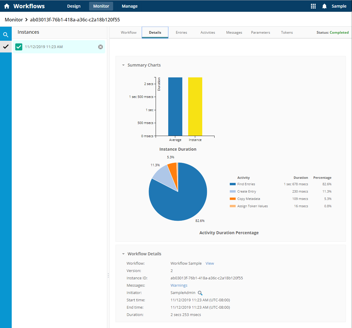 Details: View general statistics about the instance's performance. Provides insight into how long the workflow took to complete, showing possible bottlenecks in the process or areas where revision for optimization might be necessary or desired. -