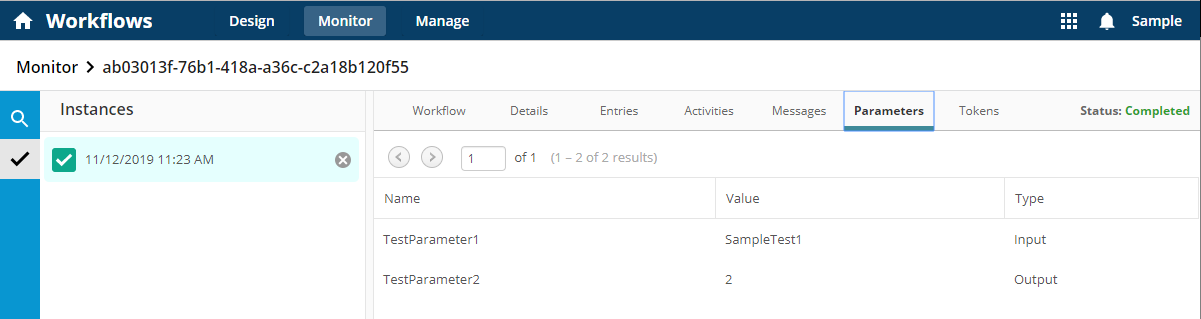 Parameters: View a list of the input and output parameters and their values within an instance. -