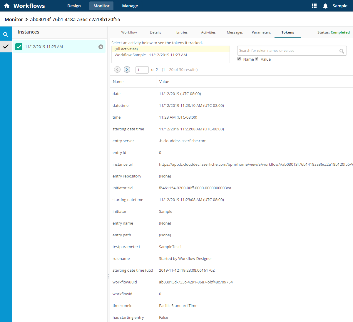 Tokens: View a list of the instance tokens along with the current value of the token. Allows users to review the tokens as they flow through the workflow.
