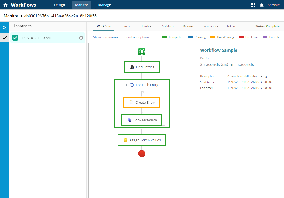 Workflow: View the workflow design, activity statuses, activity properties, and description for each activity. Allows users to easily see which activities in the workflow succeeded or failed, and which paths within conditional branches were processed. -