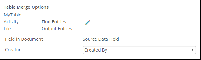 Example: You select Output Entries from a Find Entries activity. In the first field in the document Creator, you can use the Created By property, which can be found in Additional Properties in the Find Entries activity. This updates the table for each entry found.