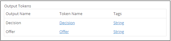 Example: In the following image, the output name Decision represents the output field Decision on the Output Order decision table. The token name Decision is used to represent the token that contains the result of the decision. This token looks like %(RunRule_Decision).