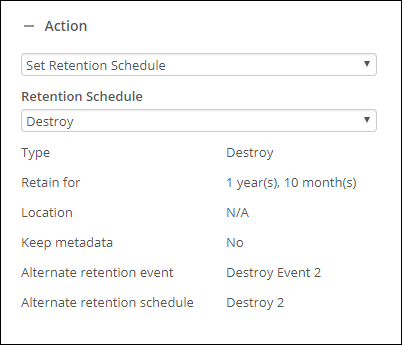 Example: The following configuration makes the record in the Apply Properties To property box eligible for destruction, along with the metadata of the record, after 1 year and 10 months. If the retention event does not occur, the alternate event is taken.